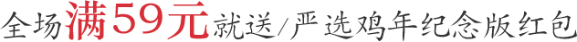 · 1.10-1.20活动期间,全场单笔订单满59元就能获得一份鸡年纪念版红包,每个订单都可获得一份,多买多得,5万份红包,送完为止!· 红包5个一份,价值19元,随单赠送,请下单时在购物车选择赠品红包哦~